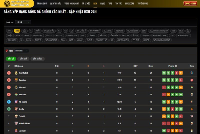 Trên Socolive, bảng xếp hạng không chỉ có Ngoại Hạng Anh, Serie A hay Bundesliga, mà còn có cả bảng xếp hạng bóng đá Tây Ban Nha được cập nhật real-time sau từng bàn thắng.