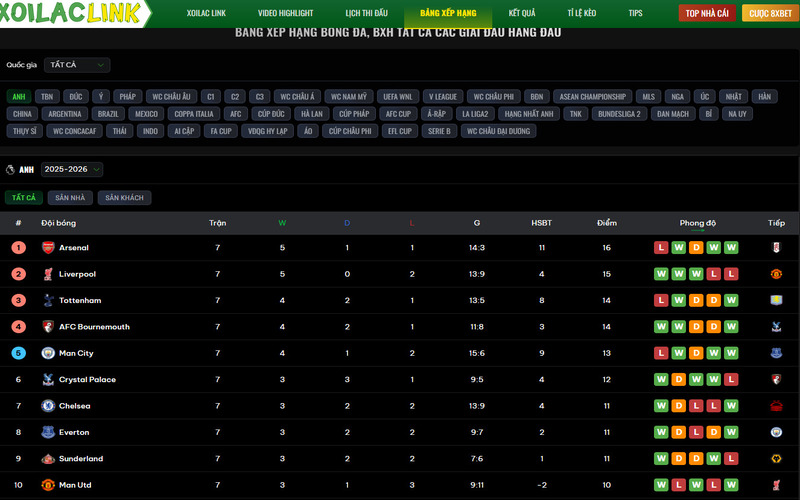 XoilacTV cập nhật bảng xếp hạng trực tuyến nhanh và đầy đủ nhất